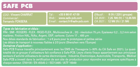 2020-2021 : 2020, année de Covid, a connu une récession brutale des commandes au 2ème trimestre. Habitué à des taux de croissance proche de 30% depuis 2012, Safe-PCB a connu une stabilisation de son carnet de commande.