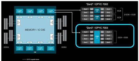 AMD combine en outre jusqu’à huit cœurs Zen en un seul chiplet, appelé "core complex die" (CCD).