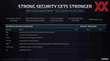 Comme c’est le cas pour l’ensemble de la famille EPYC, l’EPYC 7003 dispose d’un processeur sécurisé séparé qui fournit une protection supplémentaire contre les tentatives de manipulation. La virtualisation cryptée sécurisée (SEV, depuis l’EPYC 7001) permet le cryptage des VM à l’aide d’une clé unique, qui n’est connue que du processeur sur lequel la VM s’exécute. Ainsi, différentes VMs sur le même CPU EPYC peuvent être séparées les unes des autres de manière sécurisée. L’état crypté SEV (SEV-ES, depuis EPYC 7002) étend cette fonctionnalité au registre mémoire que l’hyperviseur alloue à la VM, permettant son cryptage par l’activation d’un module supplémentaire, le GHCB (guest hypervisor communication block). Tout cela garantit que l’hyperviseur, même s’il est lui-même corrompu, ne peut jamais lire les données de stockage de la VM puisque le GHCB, qui se trouve entre la VM et l’hyperviseur, envoie toujours du contenu crypté en réponse aux demandes.
