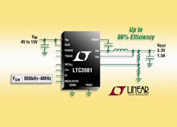 Le LTC3¬601 est un régulateur à découpage, synchrone, 4 MHz, de haut rendement, de Linear Technology, qui comprend une architecture en mode courant et à contrôle de la fréquence. Il peut fournir une intensité continue de sortie jusqu’à 1,5 A, pour des tensions de sortie aussi basses que 0,6 V, à partir d’un boîtier QFN, 3 mm x 3 mm, ou MSOP-16 à performances thermiques renforcées. Le LTC3601 fonctionne à partir d’une tension d’entrée comprise entre 4 V et 15 V, ce qui le rend idéal pour les applications alimentées sur deux éléments de batterie Li-ion, ainsi que pour les systèmes à bus de tension intermédiaire de 12 V. Sa fréquence de commutation est réglable par l’utilisateur de 800 kHz à 4 MHz, permettant l’emploi de petits condensateurs et inductances, de faible coût.