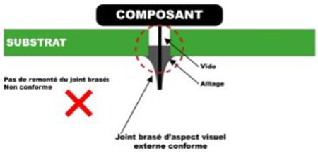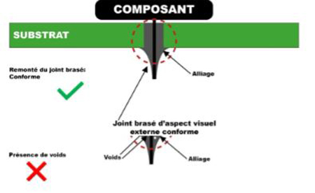 Ces cavités peuvent se former pendant le processus de brasage et piéger de l’air ou des résidus tel que des résidus de flux. Il est nécessaire de travailler avec des flux adaptés et de s’assurer de l’absence d’impuretés et d’oxydation. La mise au point du profil thermique sera également déterminant pour en prévenir la formation. Il convient alors pour limiter les voids de maîtriser le process avec une grande répétabilité. En refusion travailler sous vide (phase vapeur ou convection) permet de diminuer de façon significative les taux de voids dans les joints brasés mais ces procédés ne sont pas envisageables à la vague. Seule une inspection au rayon X peut permettre de valider l’absence de ces cavités d’un joint brasé. L’absence de voids est un élément essentiel pour l’électronique de puissance à ne pas négliger. La présence de ces cavités aura pour conséquences de modifier le gradient thermique et les lignes de courant. Cela se traduira notamment par une