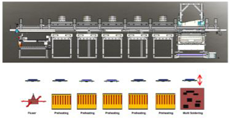 Sasinno propose des équipements de brasage sélectif parfaitement adaptés à l’électronique de puissance. Des solutions de préchauffage mixte (infrarouge & chauffage par convection) sont mises en œuvre sur les équipements en ligne et pour les applications les plus exigeantes. La marque est en mesure d’effectuer des designs spécifiques sur cahier des charges. SASINNO a développé par exemple le système de brasage sélectif en ligne MAStamp-151 qui a permis de répondre à une application client spécifique exigeante pour le brasage de cartes de chargeurs d’alimentation pour l’industrie automobile. Cette application à forte contraintes avec une carte de 200 mm de hauteur et un poids individuel de 15 Kg pour une production de masse a été rendue possible grâce aux 5 zones de préchauffage supérieures et inférieures et au convoyeur pouvant accepter jusqu’à 107 Kg de charge répartie sur l’ensemble des 7 zones ! (Soit zone 1 : fluxage, zones 2 à 6 : préchauffage haut & bas en technologie mixte [infrarouge & convection], zone 7 : brasage sélectif).