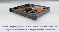 La conception de serveurs périphériques COM-HPC ne se fait pas uniquement en version mono-module. Les prototypes prennent également directement en charge les cartes multi-modules avec diverses configurations de modules COM-HPC, par exemple avec des FPGA ou des accélérateurs de calcul GPGPU. Les modules COMHPC serveur et client peuvent également être utilisés ensemble sur une même carte. Par exemple, en collaboration avec l’Université de Bielefeld et Christmann IT, congatec développe actuellement un concept de serveur périphérique intégrant plusieurs modules COMHPC différents sur une carte porteuse afin de gérer des charges de travail en temps réel extrêmes sur une consolidation multi-système pour apprentissage automatique par AI clustering de données haute dimension (cartes auto-adaptatives).