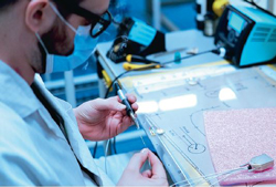 L’atelier manuel de SYSTECH compte 9 câbleurs à plein temps. Ils sont formés au brasage avec ou sans plomb (RoHS), au lavage de cartes électroniques, aux reprises CMS et filaires. Ils posent les composants électroniques à la main sous loupe binoculaire, pour les prototypes électroniques ainsi que pour les petites séries.