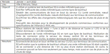 KYOCERA Corporation (« Kyocera ») et SoftBank Corp. (« SoftBank ») ont réalisé un test de vérification du système de backhaul en utilisant la bande d’ondes millimétriques allouée à SoftBank pour la 5G (appelée « bande millimétrique 5G ») dans les antennes relais de SoftBank situées dans la ville d’Akiruno, Tokyo, de janvier à avril 2022. Ce système a eu recours à une onde millimétrique 5G pour connecter un lien backhaul entre une station donneuse et une station nœud relais constituant la zone d’accès. La station donneuse était conforme aux spécifications de fronthaul de l’Alliance O-RAN1 qui se connectent au réseau. Au vu des résultats du test de vérification, Kyocera et Softbank sont heureuses d’annoncer qu’elles ont réussi à valider la stabilité des communications et l’efficacité du système.