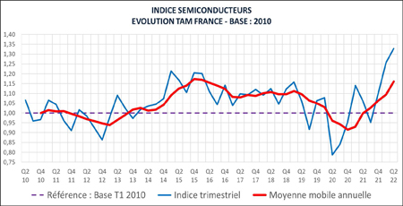 La demande de composants électroniques reste forte alors même que l’inflation mondiale va inévitablement infuser dans la chaîne de valeur du semiconducteur. Dans ce contexte, au vu des résultats présentés ci-dessus, et en se basant sur le ratio commandes/facturations (confidentiel) qui ressort de son enquête trimestrielle ainsi que sur les constatations de ses membres, Acsiel considère que le marché français, très présent sur les secteurs automobile et industriel, n’est pas entré dans une phase de détente significative bien que le marché du grand public commence à montrer des signes de faiblesses.
