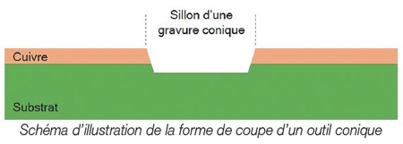Forme de gravure conique (Outil de diam. Min. de 0.1 mm) Réalise des ‘‘sillons’’ en forme de V