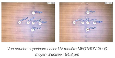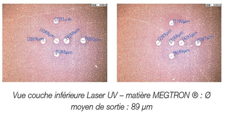 Tests réalisés sur du MEGTRON® d’épaisseur : 0.3mm avec une épaisseur de cuivre de : 17μm. L’écart est en moyenne de 5.8 μm entre le diamètre d’entrée et le diamètre de sortie.