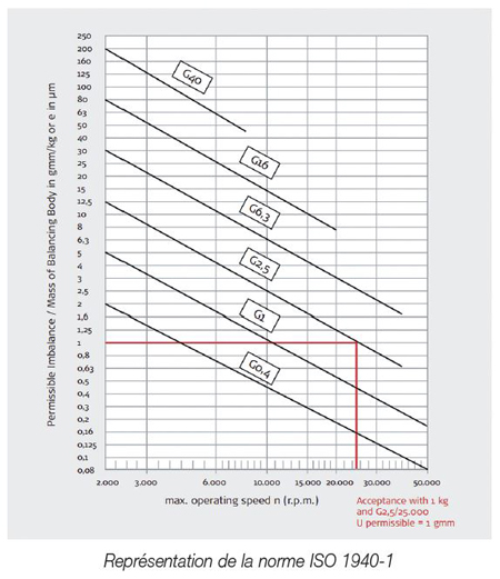 L’équilibrage est normé selon l’ISO 1940-1. A titre d’exemple, un équilibrage G2.5 autorise un déséquilibre admissible de l’ordre de 1 gmm/ Kg à 25 000 tr/min contre seulement 0.45μ pour le grade G1 à cette même vitesse alors qu’il est de l’ordre de 2.5 pour le grade G6.3. Pour des usinages de précision il est donc recommandé des broches d’équilibrage G1 ou inférieur (G0.4). A noter que la norme d’équilibrage implique une précision proportionnelle à la vitesse (plus la vitesse est élevée, plus la précision pour un même grade d’équilibrage sera importante).