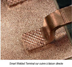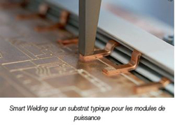 Les soudeuses à fil peuvent fournir des puissances ultrasoniques allant jusqu’à 200 W et des forces de soudage allant jusqu’à 40 N. Cela est suffisant pour des surfaces de joint de 1 à 3 mm2. La surface de contact effective peut facilement être augmentée en ajoutant des fils. Les connexions fortes sont toujours nécessaires lorsque des connecteurs massifs sont requis pour leurs performances électriques et également thermiques. Les éléments de contact tels que les terminaisons en cuivre des modules de puissance nécessitent une force de soudage de 1000 N et une puissance ultrasonique de 1,5 kW. De tels éléments sont des applications pour le Smart Welding.