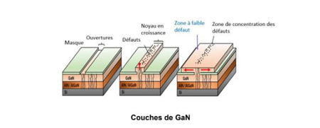 En masquant la couche de GaN avec un matériau qui ne se développe pas, on supprime la liaison entre le substrat de Si et la couche de GaN, ce qui simplifie grandement le processus de pelage.