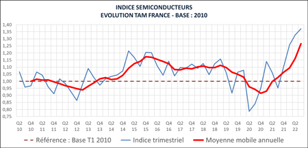 Sur les neufs premiers mois de l’année 2022, le marché est en croissance de +25%, avec des ventes par le canal de la distribution en hausse de +50% et une croissance des ventes directes au client final à +14%. Celles-ci sont tirées par l’automobile (+24%), l’industriel (+14%), l’aéronautique/spatial/défense (+30%) et la smart card (+17%), par ordre de contribution à la croissance.