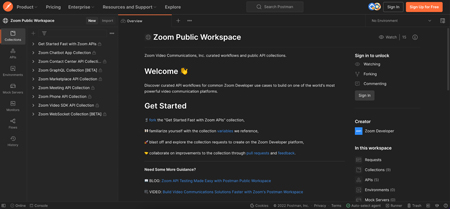 L’espace de travail Zoom Postman optimise de manière pratique le développement, les tests et la collaboration en matière de flux de travail des API. Les développeurs peuvent transférer l’espace de travail pour expérimenter sur leur propre version, surveiller les mises à jour et fusionner les modifications avec leur version locale. Il leur est également possible de partager et d’inviter des collaborateurs sur leur version fork pour faciliter le développement asynchrone. Toutes les variables, les demandes et la documentation préremplies de l’espace de travail peuvent être exploitées pour obtenir des conseils faciles à suivre. En commentant l’espace de travail ou en soumettant des demandes de tirage à la plateforme Zoom Developer, les utilisateurs peuvent contribuer à perfectionner les API de Zoom.