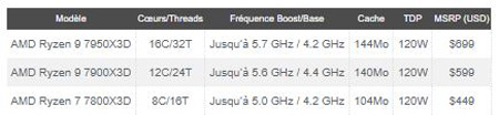 Les Ryzen 9 7950X3D et Ryzen 9 7900X3D seront disponibles pour le socket AM5 le 28 février avec un MSRP démarrant à $699 USD et $599 USD respectivement. Le Ryzen 7 7800X3D sera quant à lui disponible le 6 avril, avec un MSRP démarrant à $449 USD. Ils seront disponibles à la vente auprès des partenaires et revendeurs agréés d’AMD dans le monde entier.