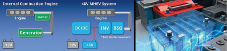 La principale raison pour laquelle le 48 V est apparu dans les années 2010 est la réglementation sur les émissions. Les constructeurs automobiles produisant des moteurs à combustion interne devaient atteindre leurs objectifs en matière d’émissions, et aussi accroître le rendement énergétique en améliorant leurs groupes motopropulseurs. Le système hybride doux (MHEV) est réputé simple et peu coûteux. La raison pour laquelle les constructeurs automobiles ont préféré le MHEV est qu’il était facile à fabriquer. Un système MHEV peut être obtenu en ajoutant un système 48 V au groupe motopropulseur classique à moteur à combustion interne existant. La réduction d’émissions peut être obtenue à un coût inférieur à celui d’un système hybride complet. Mais la question demeure : pourquoi avoir choisi 48 V en particulier ? La raison est que, dans de nombreux pays, 60 V est considéré comme une tension basse non dangereuse pour le corps humain. En outre, les lignes téléphoniques utilisent elles aussi des systèmes d’alimentation 48 V depuis une centaine d’années, ce qui démontre encore la sûreté des systèmes 48 V à bord de véhicules.