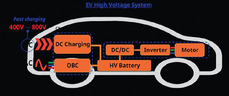 La configuration de base du groupe motopropulseur des véhicules électriques consiste en une batterie haute tension, un onduleur et un moteur électrique. Les groupes motopropulseurs des VE utilisent la haute tension. L’efficacité d’un VE est liée à l’efficacité du convertisseur CC/CC. Les voitures électriques utilisent différentes technologies de conversion d’énergie, telles que LDC, OBC, et Inverter. Différentes topologies de convertisseurs CC/CC sont utilisées pour parvenir à des résultats similaires. Par exemple, l’OBC (On Board Charger, ou chargeur embarqué) et le LDC (Low-voltage DC/DC Converter, ou convertisseur CC/CC basse tension) ont été développés pour intégrer des systèmes permettant de réduire le nombre de composants et de gagner de la place.