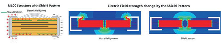 En quoi l’architecture d’un MLCC haute tension est-elle différente de celle d’un MLCC classique ? La fiabilité doit être garantie dans les environnements haute tension. Les MLCC utilisés pour les applications haute tension sont exposés au risque d’arc électrique, où un court-circuit peut se produire à l’intérieur du MLCC. Sous haute tension, un fort champ électrique se forme autour du MLCC, et ionise l’air environnant. En particulier, un champ électrique élevé se trouve concentré sur les deux bornes du MLCC. S’il dépasse la tension d’amorçage de l’air ionisé, des arcs électriques peuvent se produire, et finalement entraîner un court-circuit à l’intérieur du MLCC. La structure permettant d’éviter ce phénomène est un blindage à l’intérieur du MLCC.