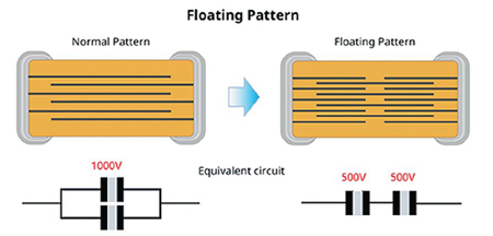 La conception flottante réduit le risque de court-circuit en cas de fêlure du MLCC, mais elle est aussi utile pour les produits haute tension. La structure flottante distribue la tension de sorte que la tension à l’intérieur du MLCC ne dépasse pas la moitié de la tension aux bornes. Par exemple, Si 1 000 V est appliqué aux bornes du MLCC, et que la conception flottante est utilisée, seulement 500 V est appliqué à la couche diélectrique du MLCC, soit la moitié des 1 000 V. C’est un avantage certain du point de vue fiabilité, puisque le champ électrique appliqué entre couches diélectriques se trouve réduit. La tension et la température sont des facteurs clés pour déterminer la durée de vie des MLCC.