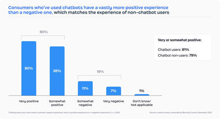 Concernant l’automatisation, 81 % des utilisateurs de chatbot ont affirmé que leur dernière expérience de support était positive. Dans l’étude, ils sont 67 % à avoir utilisé un chatbot au moins une fois au cours de l’année écoulée.