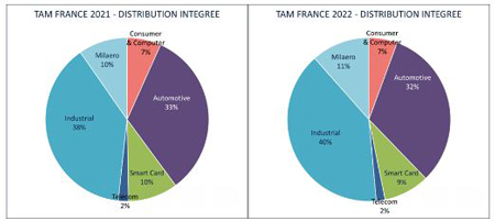 Les deux autres piliers du marché français sont le secteur aéronautique / spatial / défense, en forte accélération (+64% en 2022), et les applications sécurisées en pleine expansion traditionnellement regroupées sous le vocable « smart card » (+27%).