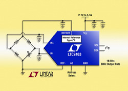 Le LTC2463 est présenté en même temps que le LTC2461, un CAN 16 bits, à interface I2C, qui mesure des entrées unipolaires de 0 V à 1,25 V. Le LTC2463 et le LTC2461 rejoignent le LTC2453 (entrée différentielle, ± 5 V), et le LTC2451 (entrée unipolaire, 0 V à 5V), déjà diffusés.