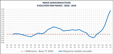 La surperformance du marché français s’explique surtout par le poids prédominant des segments industriel et automobile qui représentent respectivement 40% et 32% du total alors que ces segments sont structurellement en croissance soutenue, ainsi que par la dynamique des marchés aéronautique/spatial/défense et smart card. Tiré par ces segments, l’indice du marché en moyenne annuelle glissante est en hausse régulière depuis deux ans (voir graphique).