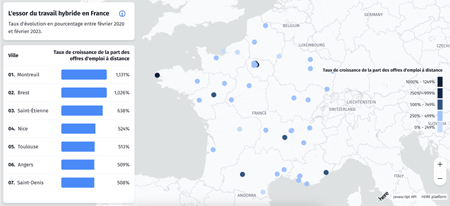 Aperçu de l’essor du travail hybride en France entre mars 2022 et février 2023 (carte interactive).