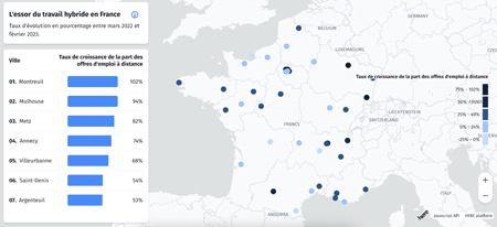 Aperçu de l’essor du travail hybride en France entre février 2020 et février 2023 via une carte interactive (HERE Technologies).