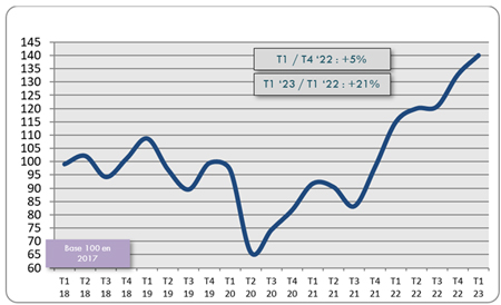Au premier trimestre 2023, l’indice des équipements d’investissement a enregistré une croissance en glissement annuel de 16% mais une croissance séquentielle de 2% seulement, et qui dissimule des orientations différenciées, d’après les enquêtes de conjonctures menées par Acsiel.
