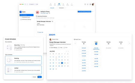 Les fonctionnalités de Zoom Scheduler comprennent également la possibilité de programmer des réunions individuelles ou de groupe, de préciser le nombre de personnes pouvant participer à un horaire disponible et de choisir des disponibilités récurrentes ou personnalisées pour les réunions ponctuelles. Les hôtes peuvent également générer des créneaux lorsqu’un ou tous les membres de l’équipe sont disponibles, automatiser et personnaliser les notifications par mail et collecter les informations souhaitées au cours du processus de réservation des participants.
