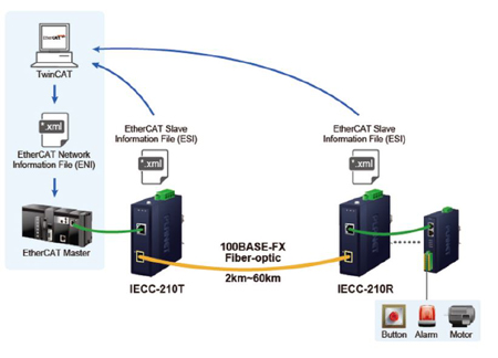 Présenté par ADM 21, l’IECC-210T, compatible EtherCAT pour Industrial Fast Ethernet, sert de convertisseur de média du cuivre vers la fibre optique tandis que l’IECC-210R fait le contraire. Il peut être diagnostiqué comme deux appareils EtherCAT distincts.