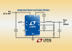 Linear Technology Corporation annonce le LT3970, un régulateur à découpage, abaisseur, 350 mA, 40 V, avec diodes élévatrice et de roue libre. Le fonctionnement en Burst Mode® maintient le courant de repos inférieur à 2,5 µA en l’absence de charge. Le LT3970 fonctionne à partir d’une gamme de tensions d’entrée de 4,2 V à 40 V, ce qui le rend idéal dans les applications industrielles et de l’automobile. Son commutateur interne de 550 mA peut fournir un courant continu de sortie jusqu’à 350 mA, sous des tensions aussi basses que 1,21 V. Le fonctionnement en Burst Mode® du LT3970 permet d’avoir un courant de repos très faible, ce qui convient aux applications comme les applications industrielles et de l’automobile qui nécessitent un fonctionnement ininterrompu et une autonomie sur batteries optimale.