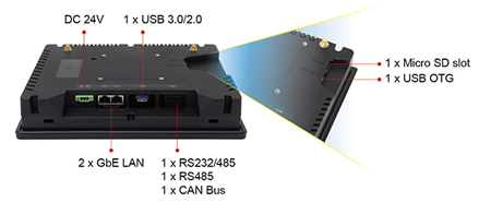 L’ARMPAC-6A est disponible en 7’’ et 10’’ avec dalle tactile capacitive projetée. Il est compact, léger de par sa conception en plasturgie et durci, équipé d’un processeur NXPI.MX8M Plus Quad, 4x Cortex A53. Il est également IP65 face avant. L’ARMPAC-6A prend en charge 4 Go de RAM LPDDR4 et 16 Go de mémoire Flash eMMC intégrées, ainsi qu’un emplacement micro SD pour le stockage. Il est équipé de 1x USB 3.0, 1x USB OTG, 2 ports Gigalan dont 1 POE optionnel, et 1 bornier 10 broches avec 1x RS232/485, 1x RS485, 1X bus CAN.