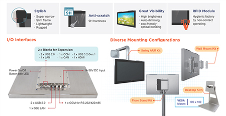 Ce Panel PC INOX primé, fait preuve d’une conception moderne pour des utilisations hygiéniques de par sa fabrication en INOX et doté de vis hygiéniques ainsi que d’interfaces E/S étanches et modulables. La PhanTam-921CP est équipé d’un processeur Intel Core I de 11ème génération offrant des performances exceptionnelles. Il répond à la norme IP69K, de connecteurs M12, d’une antenne pour les connexions sans fil avec capot, et de boulons hygiéniques spéciaux. Il propose également différentes solutions de montage polyvalentes. Il convient aux applications d’hygiène élevées, comme l’agro-alimentaire, l’industrie pharmaceutique et chimique mais aussi les salles blanches.