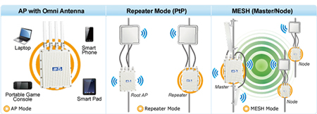 Avec des caractéristiques haute puissance, longue distance, fiables et complètes, le WDAP-3000AX conçu avec une architecture matérielle IP67 durable et robuste et une efficacité sans fil spectaculaire est parfait pour toute infrastructure réseau extérieure. Avec des antennes à gain plus élevé et une conception double RF, le WDAP-3000AX convient à diverses applications. Par exemple, le WDAP-3000AX peut établir la liaison terrestre via la radio 5 GHz, puis relayer le signal sans fil via la radio 2,4 GHz pour fournir un service Internet aux résidents ruraux. Avec le WDAP-3000AX, une infrastructure sans fil extérieure dans un environnement difficile peut être rapidement déployée pour réduire les coûts de câblage et le temps d’installation.