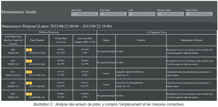 L’analyse automatique des erreurs de prise, qui fait appel à des méthodes d’analyse telles que l’évaluation des flux ou le diagnostic des codes d’erreur, des données de l’état de santé et de la reconnaissance d’images, compte parmi les outils disponibles. Les utilisateurs peuvent voir l’heure et les circonstances de toutes les erreurs de prise, l’emplacement exact et les mesures correctives (Illustration 2). Yamaha a effectué des tests chez l’un de ses principaux clients, un grand constructeur automobile, pour vérifier la précision de l’analyse automatique des erreurs de prise avec cet outil. D’autres fonctions intégrées facilitent la détection des causes premières, notamment la gestion des résultats de l’évaluation automatique et le suivi des contre-mesures.