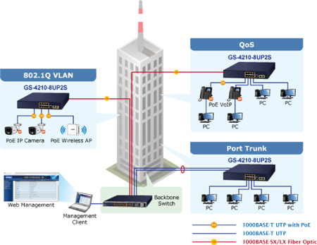 Le GS-4210-8UP2S propose une conception non bloquante et des modules SFP, apportant à l’infrastructure réseau une plus grande flexibilité avec un coût moindre. Fournissant huit ports PoE 10/100/1000BASE-T 802.3bt/at et deux ports Gigabit SFP, le GS-4210-8UP2S peut facilement intégrer la vidéosurveillance via un système NVR pour les SOHO/PME. Par exemple, il peut fonctionner avec huit caméras IP PoE et étendre facilement l’infrastructure réseau des entreprises d’aujourd’hui.