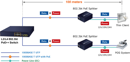 Le GS-4210-8UP2S peut facilement créer une solution réseau PoE++ 802.3bt sur le système de cybersécurité des entreprises. Par exemple, il peut fonctionner avec le système de point de vente et le client léger pour assurer une protection de sécurité complète des entreprises d’aujourd’hui. Le GS-4210-8UP2S et le répartiteur PoE++ 802.3bt - POE-173S fonctionnent de paire pour fournir le moyen le plus simple d’alimenter vos appareils non PoE tels que les ordinateurs portables, les clients légers, les systèmes de point de vente, les systèmes PTZ, les caméras IP et autres appareils réseau distants jusqu’à 100 mètres.