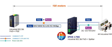 Dans un endroit où il est difficile de trouver une source d’alimentation ou une vitesse de connexion correspondante, l’IPOE-176S sépare les données numériques à une vitesse multi-Gigabit (10 M/100 M/1G/2,5G/5G/10 Gbit/s) ainsi que l’alimentation en trois sorties optionnelles (12 V/19 V/24 V DC), le tout vers des appareils non PoE tels que HMI industriels 4K, points ODU 5G-NR et autres appareils réseau, à une distance allant jusqu’à 100 mètres.