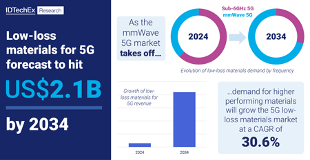 Les télécommunications 5G introduisent deux nouvelles bandes de fréquences : sub-6 GHz (3,5 - 7 GHz) et mmWave (24 - 71 GHz). C’est la 5G à ondes millimétriques qui permet une latence extrêmement faible et une largeur de bande importante, permettant ainsi un débit de données plus élevé, tous deux nécessaires pour permettre les nouvelles applications mentionnées précédemment. Ainsi, un réseau d’appareils et d’infrastructures compatibles avec la 5G se développe dans le monde entier, en particulier sur des marchés importants comme la Chine, qui domine le déploiement mondial de la 5G en bande moyenne avec plus de 68 % des parts de marché, selon IDTechEx.