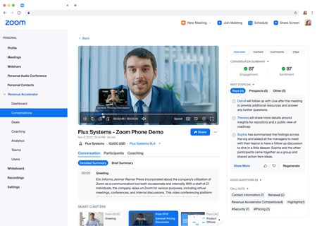 Zoom Revenue Accelerator est un logiciel d’intelligence conversationnelle tout-en-un qui vise à améliorer l’expérience client en simplifiant la manière dont les équipes commerciales travaillent. Cette solution combine la gestion de la relation client (CRM) quotidienne et des outils de vente avec des feedbacks, des informations sur les clients et des intégrations rationalisées.