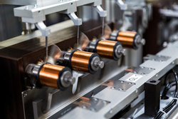 Grâce à la construction intégrée d’installations et d’outils, le KUK Group est en mesure de traiter des fils ultrafins à partir de 10 µm et de produire des micro bobines d’un diamètre de 0,3 mm. Pour les bobines miniatures à noyau magnétique, il est possible d’utiliser des noyaux composés d’une grande variété de matériaux, tels que le mu-métal, la ferrite ou les matériaux amorphes.