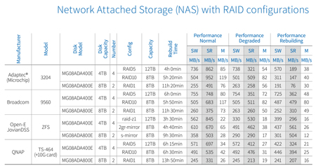 Les valeurs de performances séquentielles pour les NAS avec configurations RAID sont insignifiantes inférieures à celles des contrôleurs RAID matériels, tandis que les performances aléatoires sont similaires à celles du ZFS sans mise en cache.