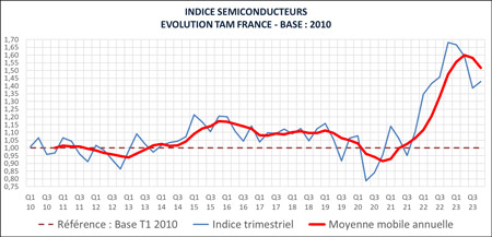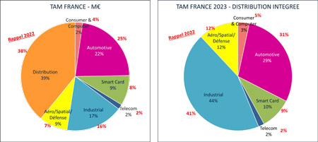 Sur l’ensemble de l’année 2023, le marché français a également enregistré une croissance de 3%, à 2,6 milliards d’euros. Les ventes à la distribution (+6%) ont joué un rôle majeur dans cette croissance et ont atteint une part record du marché français avec 39% du total. Dans les 61% vendus en direct au client final, la plus forte contribution à la croissance en valeur absolue est venue des segments Aéro/Spatial/Défense (+28%) et Industriel (+10% sur l’année, le volume des ventes ayant été très élevé au 1er semestre avant un net repli au second). Le segment Smart Card a encore connu une année favorable (+9%), à l’inverse des ventes à l’automobile (-9%). La dynamique du marché français a été freinée en 2023 en particulier par des corrections de stocks qui ne sont pas totalement terminées dans toute la chaîne de valeur et par la baisse de la demande dans certains secteurs de l’industriel, notamment la domotique et les applications de type « machine vision ». Par contre, la demande est forte dans la défense et l’avionique.