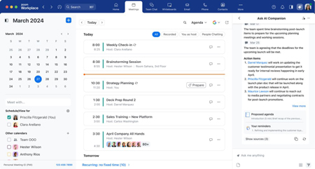 Ask AI Companion offrira une nouvelle façon d’interagir avec AI Companion à travers la plateforme Zoom. Il rassemblera, synthétisera et partagera des informations provenant de Zoom Meetings, Zoom Mail, Zoom Team Chat, Zoom Notes, Zoom Docs, et plus, pour améliorer la productivité et aider à planifier la journée de travail. Ask AI Companion permettra de se préparer pour les réunions et de les récapituler, de montrer les points d’action pertinents, de rédiger des ordres du jour et de résumer les fils de discussion, les e-mails et les documents. Dans une version ultérieure, il pourra également extraire du contenu pertinent de certaines applications tierces (si le client choisit de les activer).