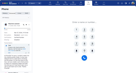 Zoom Phone est désormais doté de fonctionnalités AI Companion : les utilisateurs peuvent demander un résumé de l’appel et les prochaines étapes pour se concentrer sur la conversation au lieu de prendre des notes. S’ils manquent un appel important, la priorisation de la messagerie vocale remonte les messages urgents en tête de la file d’attente, et l’extraction des tâches de la messagerie vocale permet de comprendre les prochaines étapes sans avoir à écouter chaque message. Avec le résumé des fils de discussion des SMS d’équipe dans PowerPack, ils peuvent rapidement rattraper leur retard après s’être absentés.
