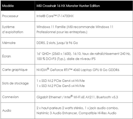 Sous ce châssis au look explosif se cachent des composants de dernière génération. En effet, un processeur Intel® Core™ i7 de 14e génération est associé à une carte graphique NVIDIA® GeForce RTX™ 4060 Laptop GPU pour répondre aux joueurs les plus exigeants. Cette carte graphique puissante permet au Crosshair 16 HX Monster Hunter Edition d’exploiter tout le potentiel des technologies Nvidia innovantes, notamment le ray tracing. La qualité d’image offerte assure alors une immersion incroyable dans le jeu, l’idéal pour l’explorer pendant des heures.