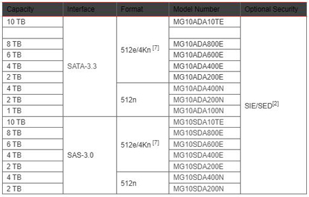 La série MG10-D est une plate-forme de 5 disques CMR air-filled de 3,5 pouces et 7 200 tr/min. Les capacités disponibles sont de 2 To, 4 To, 6 To, 8 To et 10 To pour SAS et SATA. Le SATA est également disponible dans un lecteur de 1 To. La série prend en charge les options d’interface SATA 6 Gb/s ou SAS 12 Gb/s au format Advanced 512e et 4Kn. Une option 512n est disponible sur les offres 1 To, 2 To et 4 To pour prendre en charge les systèmes existants avec des tailles de bloc natives de 512 octets. Conçue pour une fiabilité d’entreprise 24h/24 et 7j/7, la série MG10-D a une charge de travail de 550 To, un AFR de 0,44 % et un MTTF/MTBFde 2 millions d’heures.
