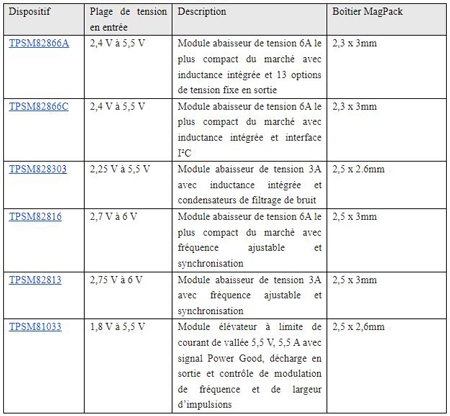 Texas Instruments (TI) présente aujourd’hui six nouveaux modules de puissance conçus pour améliorer la puissance volumique, accroître l’efficacité et réduire les interférences électromagnétiques (EMI). Ces modules de puissance bénéficient de la technologie propriétaire de boîtier magnétique intégré MagPack. Ce conditionnement permet de réduire leur taille jusqu’à 23 % par rapport aux modules concurrents. Les concepteurs d’applications industrielles et professionnelles ainsi que les concepteurs de solutions de communication accèdent ainsi à des niveaux de performance inédits. Sur les six nouveaux modules, trois (le TPSM82866A, le TPSM82866C et le TPSM82816) sont les modules de puissance 6A les plus compacts du secteur, avec une puissance volumique de près de 1A par mm² de surface.