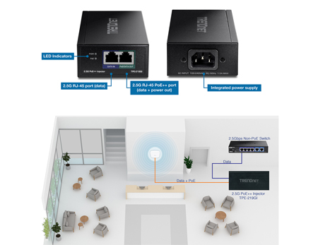 PoE++ : agissant comme un adaptateur PoE++, l’injecteur PoE++ 2,5G alimente un périphérique PoE avec une alimentation PoE (15,4 W), PoE+ (30 W) ou PoE++ (90 W)